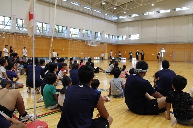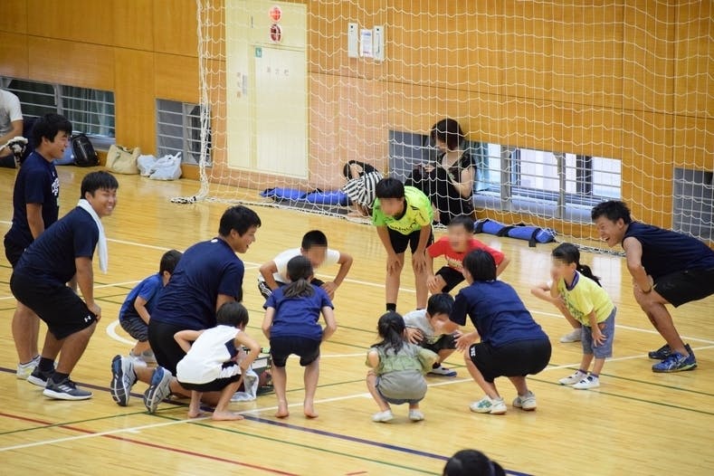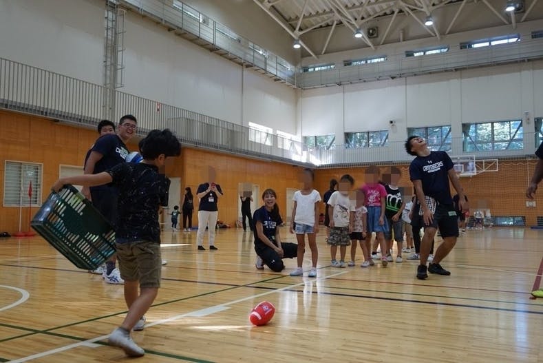 次に、こどもたちは数名でチームを組み、チームごとでゲームをしました。アメフトのボールを用いたミニゲームや、アメフト部員とのキャッチボールなど、実際に体を動かしながらボールを使って遊びました。ミニゲームが終わるころにはこどもたちも部員も汗だく!