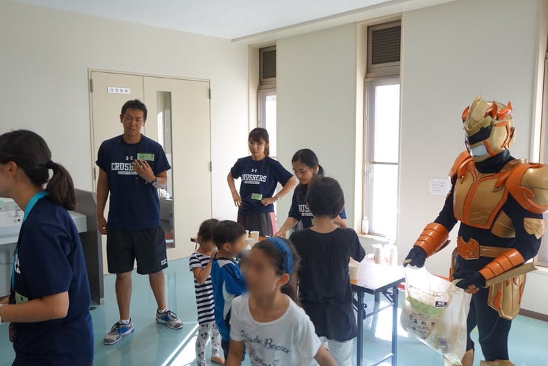 水分補給所では常にスポーツドリンクや水の配布をし、こまめな水分補給を行いました。汗だくで補給所まで走ってきた男の子が、「最高だ~~!」と言いながら水を飲みほしていたのが印象的です。汗をかいた後の冷たい飲み物は最高ですね!写真でお手伝いいただいているライダーさんは、調布市で活動されているカレーヒーローの超辛グランマサラーさんです!電通大アメフト部に直接ご連絡頂き、今回のイベントに参加してくださいました。こどもたちにも大人気で、イベント中はたくさんお手伝いいただきました。ありがとうございました!