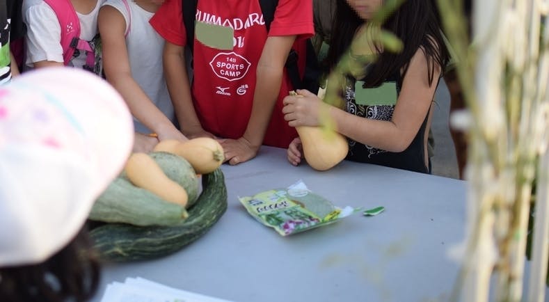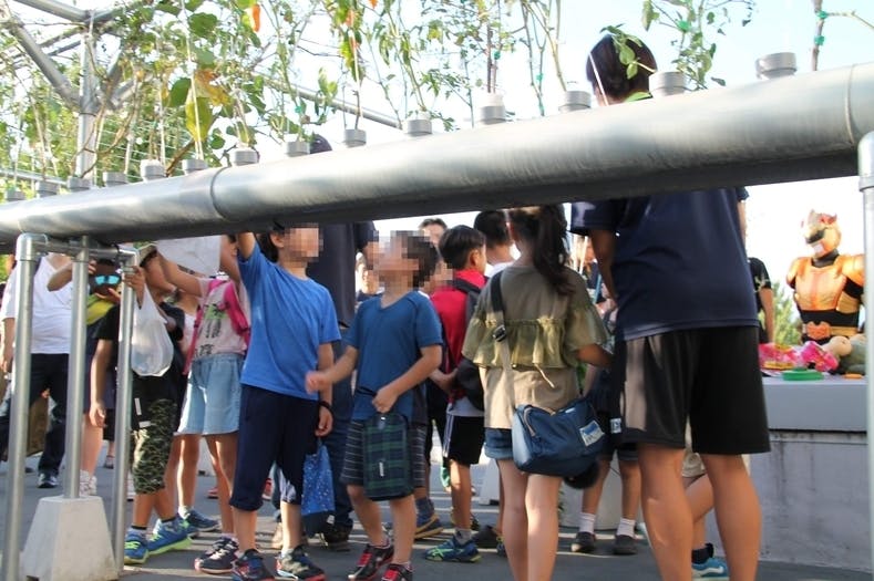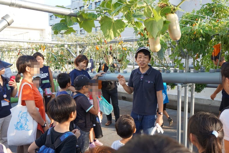 2つ目の企画は、電通大佐藤研究室が行っている都市型プランテーションの見学です。一見して普通のビルなのに、屋上で突然現れる緑の風景に驚くこどもたち。実際に電通大でとれた野菜を手に取り、植物が育つ様子を観察しました。普段自分が食べているものがどうやって育っているのかをしっかり観察することで、この後のご飯がよりおいしく感じられたのではないでしょうか。