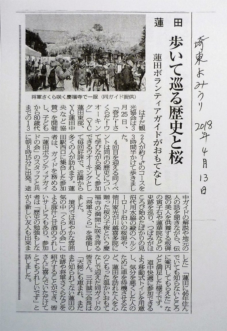 ▲平成30年4月13日に埼東よみうり紙に掲載された「将軍さくらウオーク」の記事