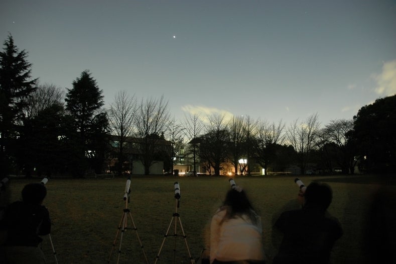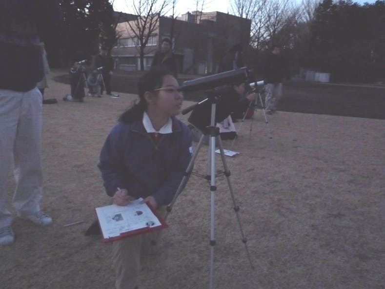 良く晴れた日、陽が暮れてあたりが暗くなり、星が輝き始めたら、自分で組み立てた望遠鏡を持って外に出てみましょう。
