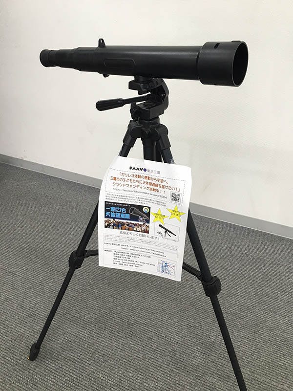 また、館内入口付近にプロジェクトの天体望遠鏡の試作品を展示して、お子様から大人の方まで自由に見ていただきました。望遠鏡の向いた先は小さな地球儀にあわせたのですが、かなり鮮明に見え、倒立像に見えるのに驚かれている様子でした。子どもたちは、大変嬉しそうでした。