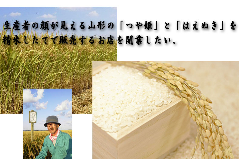 私は、生産者と直接対話し、納得したお米を、今回は山形県産の「つや姫」と「はえぬき」を販売いたします。生産者は主に十七代にわたって米農家としてお米づくりに携わってきた私の兄のお米の販売をいたします。