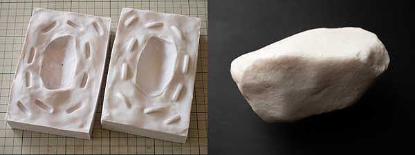 60年記念レプリカの目標は、できる限り本物の質感と重さを再現すること。シリコンで型取りし、レジンキャスト(合成樹脂の流し込み)で成形しました。レジンは比重が軽く、実物の重さ(194g)には及ばないので、鉛の重りを鋳込みます。隕石の体積とレジンの比重、鉛の比重から必要な分量を調整した結果、重量194g±1g(つまり重量誤差約0.5%以内)という高精度なレプリカを作ることに成功しました。
