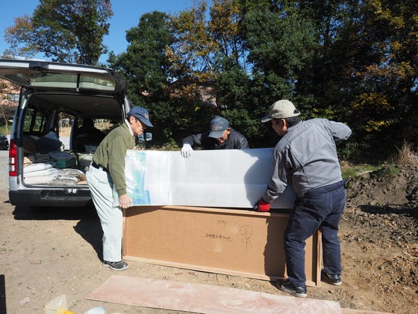 設置用に掘った穴に、神社でいただいた鎮めの御札を納め、標石に向けて丁寧に記念碑を設置していきます。保護フィルムをはがして完了!