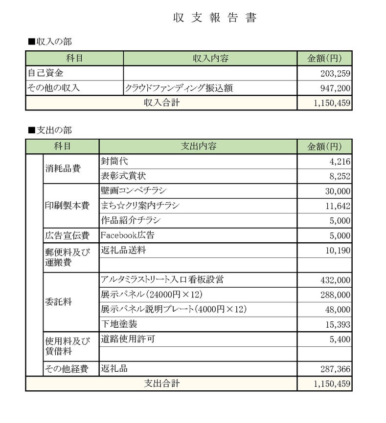 落書きからアートに! 町田の観光資源を創るプロジェクト! まちクリに対してご支援いただいた皆様へ 2018年10月13日に「まちクリ~町田クリーンアップ作戦~」は無事に開催され、皆様よりご支援いただきました”「落書き跡をスペイン アルタミラ洞窟壁画をテーマにしたアートギャラリーに!」チェンジするプロジェクト”も同日お披露目することができました。ご支援いただいた皆様に心より感謝申し上げます。 本事業で計画させていただいた皆様からのご支援に対する用途は以下の内容でした。 アルタミラストリート入口看板 450,000円展示パネル×12 250,000円展示パネル説明プレート×12 50,000円広報費(コンペ募集チラシ、クラウドファンディング募集チラシ) 60,000円壁面塗料 70,000円リターン品経費、送料 120,000円 計画に対し収支が以下のとおりとなりましたので報告いたします。 (収入) ・クラウドファンディング振込額は支援金額からサイト運営手数料が引かれて入金されています。(サイト運営手数料は広告宣伝費として考えております) ・不足分はまちクリ実行委員会の自己資金です。(地域のお祭りでわたあめやかき氷を販売して資金を賄っております) (支出) ・クラウドファンディングの返礼品の金額が想定よりも増えました。 ・壁面塗料は関西ペイント販売株式会社さまよりご協賛をいただいた為発生しておりません。 内容をご確認ください。 今回の事業がFAAVO町田の案内冊子に「目標を達成したプロジェクト」として掲載されました。 町田市のまちだ〇ごと大作戦レポートにも掲載されました 皆様のご支援で実現した「アルタミラ洞窟壁画をテーマにしたアートギャラリー」のある場所は落書きを消しても、何度も落書きを書かれてしまう場所でした。アートギャラリーにチェンジしたことで落書きはされず、市民が芸術に触れることができる場所になりました。ありがとうございました。 本日(2018.12.26)午前10時の「まちだアルタミラストリート」です。 まちクリ実行委員会はこれからも自分たちの住むまちに関心を持つ市民を増やしていくために活動してまいります。今後ともよろしくお願いいたします。良い年の瀬をお過ごしください。 まちクリ実行委員会総務広報部会部会長 市川 晴久
