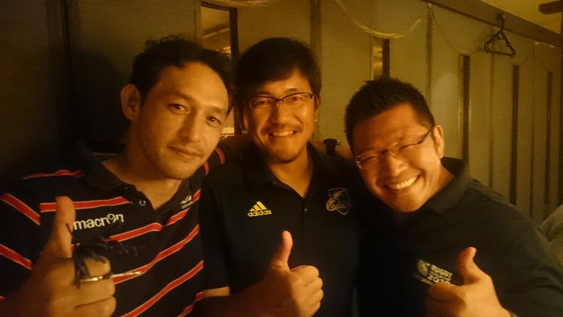 (JRFU強化コーチ研修時の写真 左:元日本代表 川合様、写真中央:清水、写真右:元日本代表 野澤様)