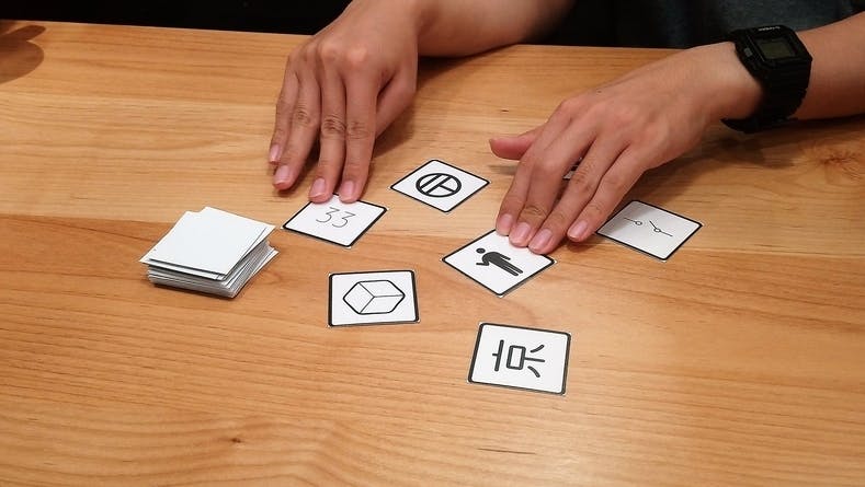 トポロジー的に同じ組み合わせの図形が見つけた人はカードのセットを取ります