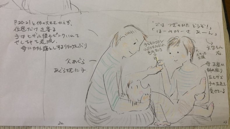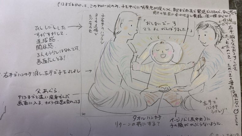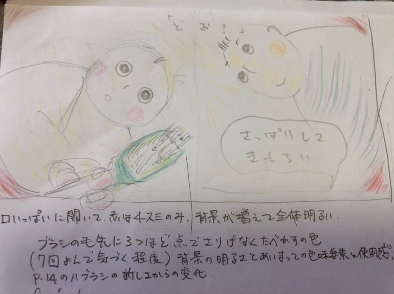 イラストの原案となるシナリオを作成中です。子供が歯磨きをしたくなるように、シナリオは細部にまでこだわっています。