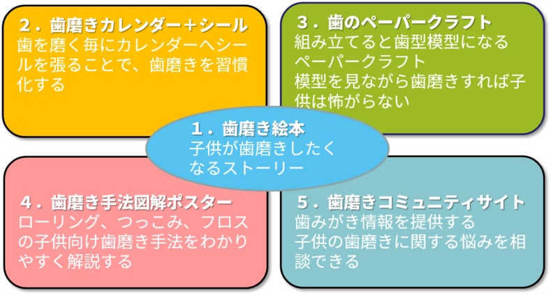 「はみがきあーん」は、絵本と4つの仕組みを合わせた「5つの仕組み」で子供の歯磨きの習慣付けをサポートします。リターンでは、「1.歯磨き絵本」「2.歯磨きカレンダー+シール」「3.歯のペーパークラフト」「4.歯磨き手法図解ポスター」の4点をセットにしてお届けします。