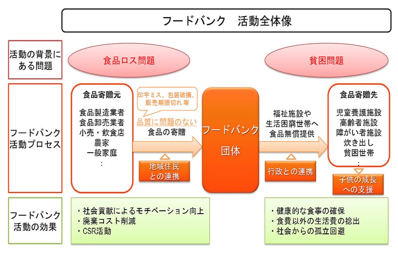 「フードバンク」とは、食品の品質には問題ないけれども、家庭にある賞味期限が残っているけど使わない食品や、企業などからの包装の印字ミスや賞味期限が近い、規格外などの理由で、通常の販売が困難な食品・食材(いわゆる「食品ロス」)の寄付を受け、生活困窮者や福祉施設等へ無償で提供するボランティア活動です。