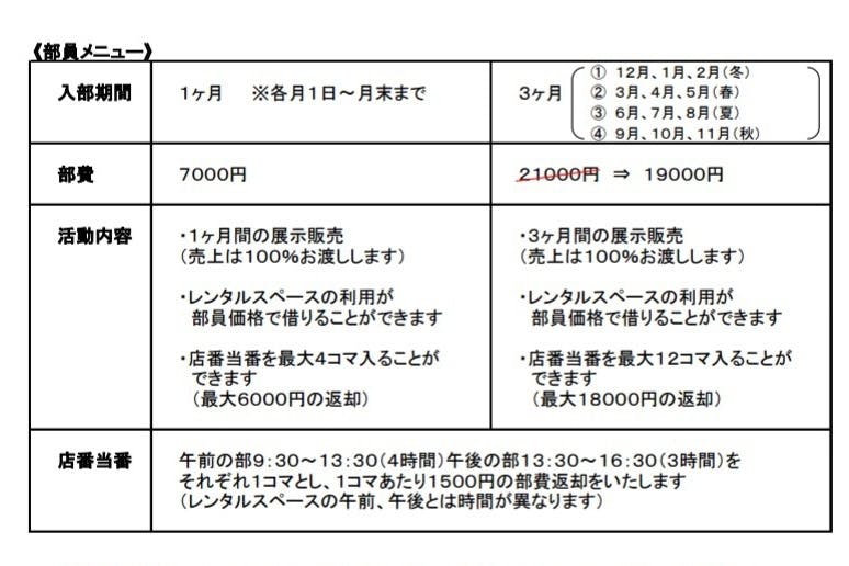 また、自分のお店として店番に入ることで、最高6000円までの部費が返却されます。その場合の部員の負担は月々1000円になります。