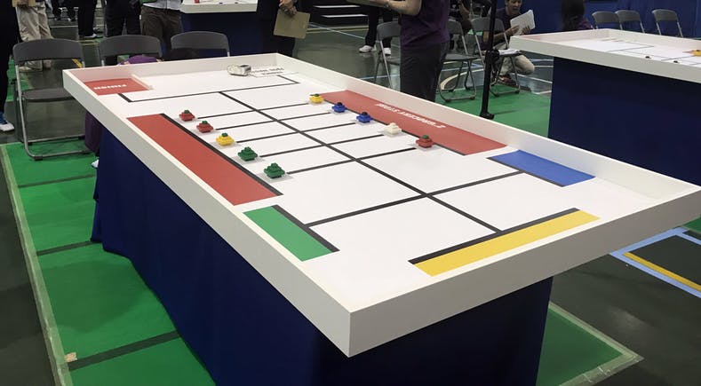 このミッションは事前に発表されていますが、教育用レゴのロボット作成キット「マインドストームEV3」を使ってロボットの機構からプログラミングをすべて考えるとなると、相当な時間を要します。このミッションを達成するためにどんなロボットが良いのか?そのロボットで2分という制限時間で間に合うプログラミングはどのようなものなのか?試行錯誤しながら完成させ大会に臨むことになります。