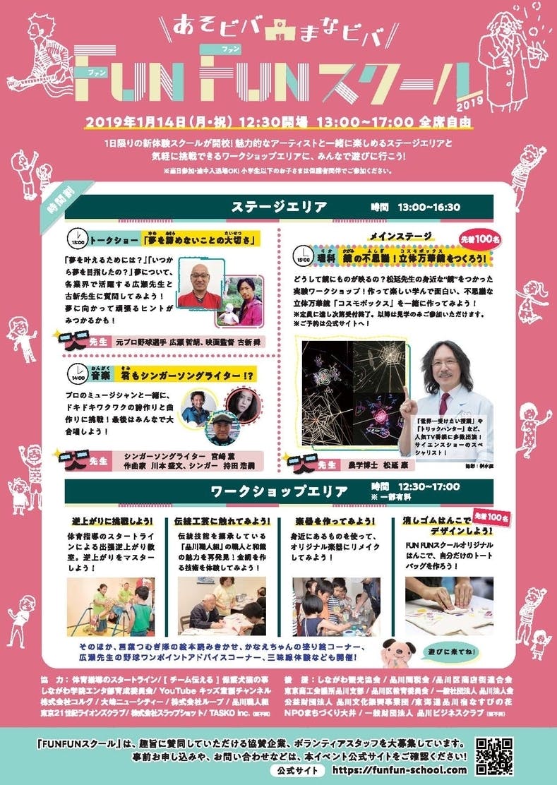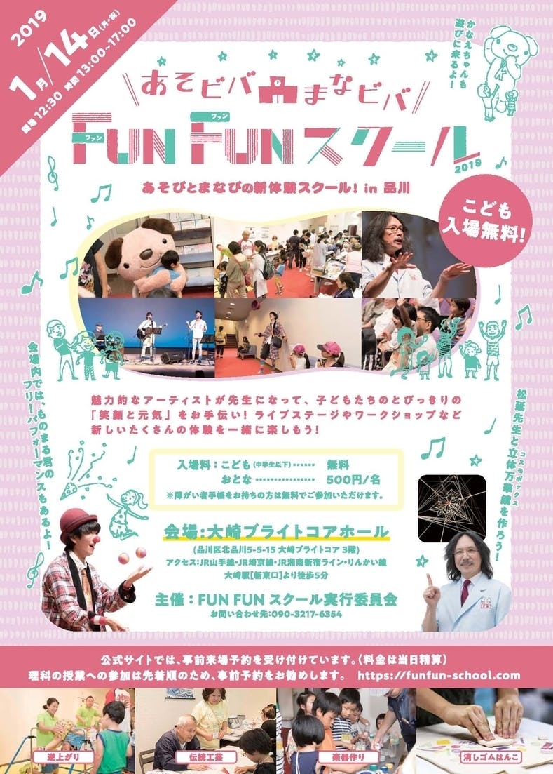 さまざまな業界のアーティストが先生になり、子どもたちのとびっきりの「笑顔と元気」をお手伝い!体験して楽しい、学んでおもしろい 1日限りのまちの遊び場&学びの場の学校『Fun Fun スクール』が大崎で開校します。魅力的なアーティストと一緒に楽しめるステージエリアと気軽に挑戦できるワークショップエリアに、みんなで遊びに行こう!