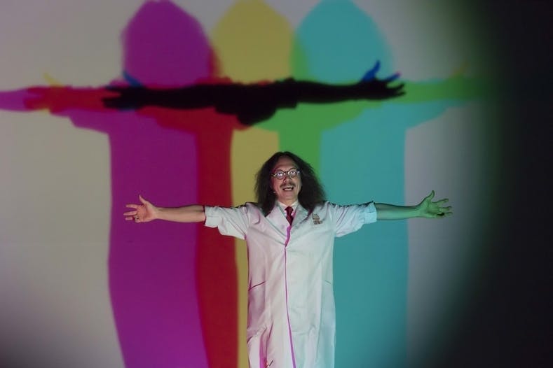 『世界一受けたい授業』『Qさま』『トリックハンター』などテレビにも数多く出演しているサイエンスショースペシャリスト・松延康先生の科学実験!テーマは光の3原色。赤・青・緑三色LEDライトを使って学んで楽しめる実験をやってみよう