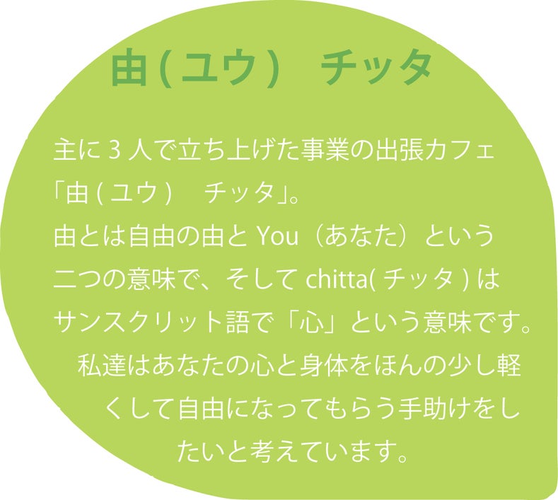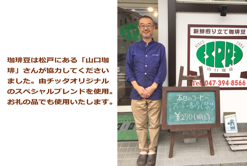 「豆はクセのないブレンドです。キリマンジャロとホンジュラス、グァテマラの3種類を使ったキリマンジャロベースの中性で飲みやすい珈琲となっています。由チッタさんの出張カフェを通して、ひとりでも多くの人に飲んでいただければ幸いです。そしてホットひと息つける珈琲でありたいと思っています。」