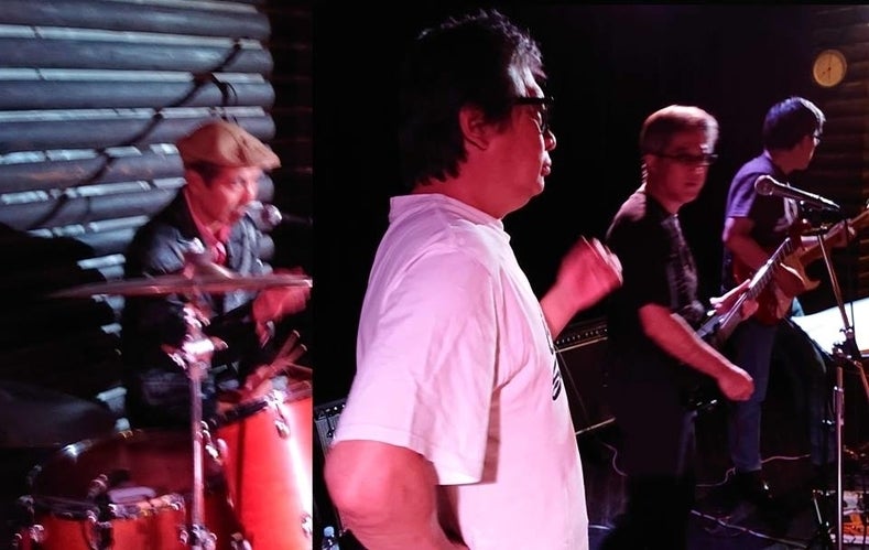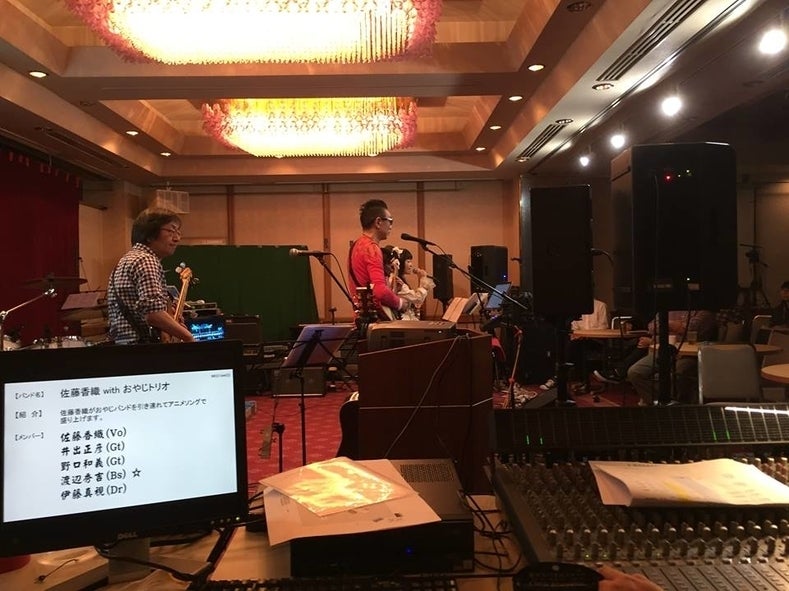 高校生の頃からの仲良し社長達の集まりバンド、写真の左端ににこやかに写っているベース、おやじトリオのリーダー渡辺秀吉さんは10代の頃、あの伝説的なテレビ番組、スター誕生でグランドチャンピオンになられています。本人は恥ずかしがって言わないのでwikipedia情報ですが…。検索すると若かりし頃に出したレコードのジャケットが出てきたりします。Mi☆Liveでも機材の提供や証明設営、電気周りをやってくれています。