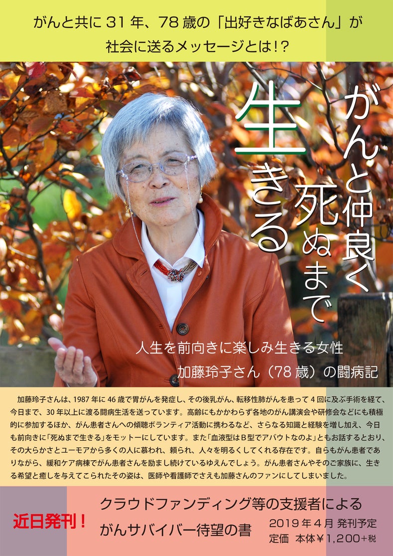 加藤玲子さんは、1987年に46歳で胃がんを発症し、その後乳がん、転移性肺がんを患って4回に及ぶ手術を経て、今日まで、日々の不安と苦悩の中で30年以上に渡る闘病生活を送っています。「出好きなばあさん」を自認する加藤さんは、高齢にもかかわらず東京を初め各地のがん講演会や研修会などにも積極的に参加するほか、がん患者さんへの傾聴ボランティア活動に携わるなど、さらなる知識と経験を増し加え、今日も前向きに”死ぬまで生きる”(本人のモットー)を、実践しています。