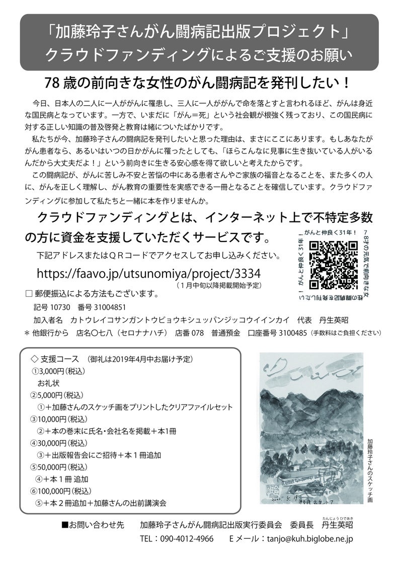 私たち応援団は彼女のその思いを闘病記として発刊し、がん患者はもとより、がんとは無縁の全ての人々の心にヒットするメッセージ集としてお届けしたいと考えました。その実現のために、より多くの皆さんのご協力をいただきたく、クラウドファンディングを実施することにいたしました。