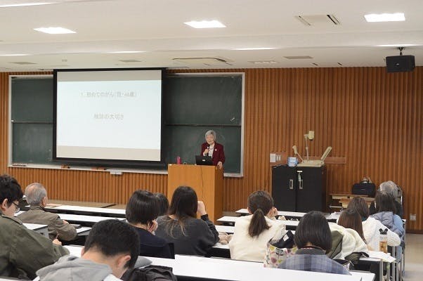 31年前に発病した1度目のがんから、昨年5度目のがんまでのお話を約1時間ほどして下さり、大学生や一般市民あわせて50名ほどが熱心に聴いていました。