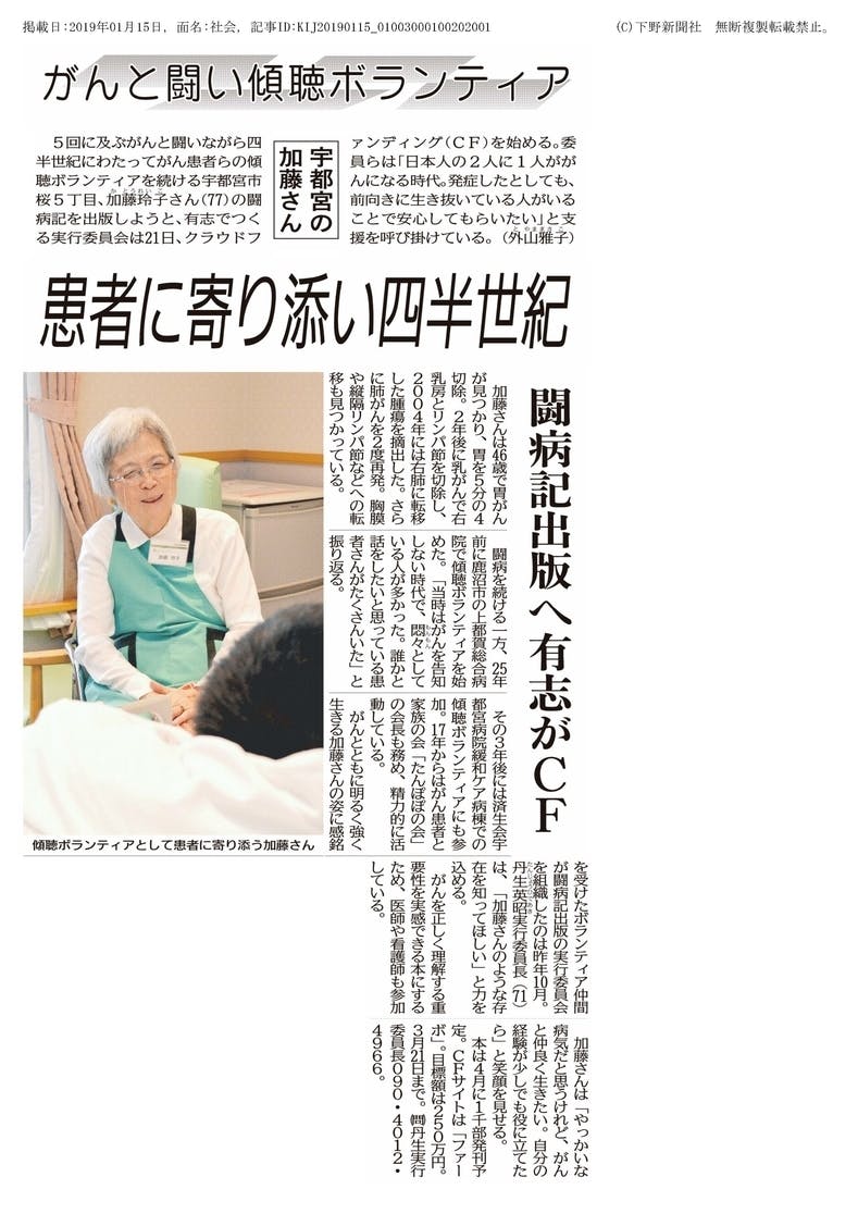 がん闘病記出版の記事が、1月15日に栃木県の下野新聞に掲載されました。