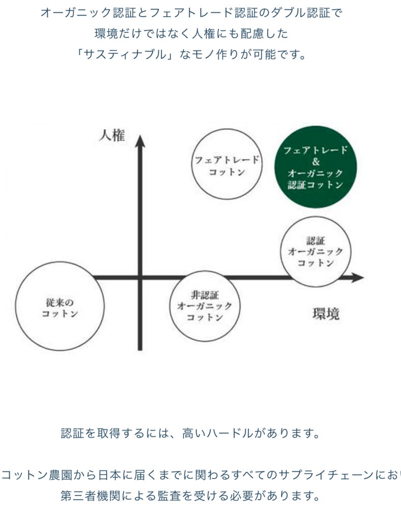 全てをクリアできたオーガニックコットンだけがGOTS認証を取れはるんですけど。それも畑、工場すべて、それを製品化する企業も皆がGOTS認証を持っていないと×あかん!!っていう、スーパー徹底ぶりなんですよ。
