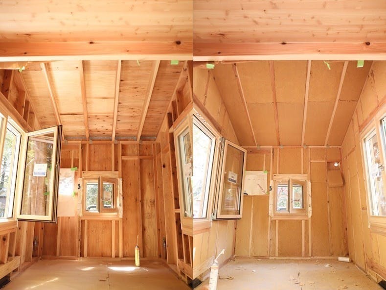 断熱材(ウッドファイバー)の充塡前と、充填後の状態