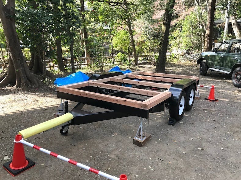 土台を固定した上に「からパネル」(唐松・三層パネル)を設置して、床(ステージ)が完成しました。あとは壁パネルの製作を地道に進め、ワークショップの時に一挙に小屋化します!きっと、楽しいですよ! ぜひご参加ください。