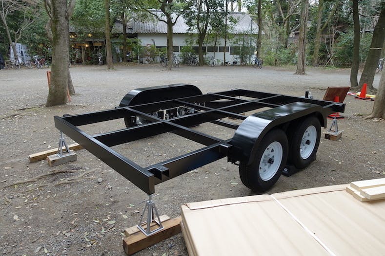 実は昨日、さまざまなものが搬入されました。深大寺の現場には、Treeheadsの竹内さん達が、シャーシ(車台)を搬入してくれました。今日から、深大寺と事務所を何度も往復する毎日が始まっています。今朝も多くの人が立ち止まって興味を示してくれるので、たびたび説明をすることに。。嬉しいけど、作業が進まない (^_^;)