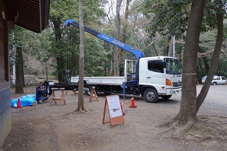 昨日の搬入風景。ユニックのトラブルがあって、夕方の搬入となりました。