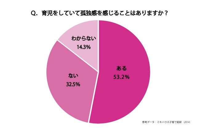2014年度ミキハウスの調査によると、「子育てにおける孤独感を感じたことがある」と答えた母親は半数以上。「どんな時に孤独感を感じるか」という問いには、63.7%が「子どもと自分だけで家にいる時」と答えています。