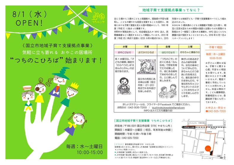 『つちのこひろば』は、NPO法くにたち農園の会が運営している子育て広場です。2018年8月に国立市から「親子が気軽に立ち寄り、相互に交流を図るための常設施設と出張広場を実施する事業」として受託し、オープンしました。