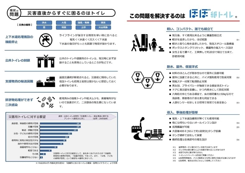 2019/02/08 12:13プロジェクト公開から2週間が経過し、中盤に差し掛かっています。 11名の方から73000円のご支援をいただき、現在達成率は18%となっております。多大なるご支援に心より感謝申し上げます。 さて、本日は出展してくださる企業のご紹介第1弾。株式会社カワハラ技研さんです! カワハラ技研の小野さんにお話をお聞きしました。 ―小野さん、よろしくお願い致します。 はい、よろしくおねがいします。 ―今回、みたか防災マルシェでご紹介いただけるカワハラ技研さんの商品はどんなものですか? 「ほぼ紙トイレ」という商品名の備蓄型組立式個室トイレです。 ―「ほぼ紙トイレ」ですか!興味深いですね。どんな特徴がありますか? 便器、タンク、仕切りを全て1つに集約した、完全個室型の大容量トイレであり、他に何も要りません。唯一ご用意していただくのがトイレットペーパーと重石用の砂やガラだけです。また、ほぼ紙でできているので、全て完全に焼却可能で衛生的という特徴もあります。 自治体管轄の避難所は勿論のこと、マンション、オフィス、工場、自治会等々、個人でなく 多くの人たちが集合していいるところにこそ備えて頂ければ、発災直後から、インフラが回復 するまでの一番手薄なところをカバーできるトイレです。 ―そうなんですね。トイレの大切さは私たち実行委員会もマルシェでぜひ伝えたいと考えています。なぜこの商品を開発されたのですか? 災害時、最も大切なことは、食べることと排泄することです。いざという時の為には「備蓄すること」こそが大切です。皆さん食べ物や毛布等々は直ぐに対応可能かと思いますが、トイレがやっかいです。携帯トイレを持っていることで安心されている方も多くいらっしゃいますが、実際はデメリットもあります。マンホールトイレや届くのに日数が必要な仮設トイレという選択肢もありますが、それぞれにもデメリットがあります。そこでそれぞれのトイレに不足している部分をカバーする必要があると考えて、「ほぼ紙トイレ」を開発するに至りました。 ―なるほど、それぞれのデメリットをカバーする商品ということですね!実物を拝見するのが楽しみです。今日は、お忙しいところありがとうございました。 ありがとうございました!「ほぼ紙トイレ」は被災経験女性たちの意見と取り入れた、女性に優しいトイレです。これ一つで完全な個室が完成し、安心して利用できます。みたか防災マルシェにお越しの際は、ぜひ私たちのブースにお立ち寄りください! <商品特長> タンク(30㎏)とボックス(32㎏)と2分割で保管、いざという時直ぐに運び出し使用可能。 工具なしで女性2人で約20分で組立OK、男性ならば10分程度。 上下水道や電気がダメになっても使用可能。⇒災害時にはトイレは直ぐに届きません。 外での使用対応。(耐水紙製、タンク部分のみ樹脂製) 容量が400ℓ 約1600回分(毎日50~60人使用で1週間) 夜でも安心、LED照明付 ⇒防犯対策 ドアは内開き、鍵付 ⇒ 〃 バイオ製剤使用で防臭・抗菌対策 最後は全て焼却可能 ⇒ ゴミの山にならず衛生的 使わなければ長期保存可能。(3年毎にLED用単三電池3本とバイオ製剤1本(1ℓ)を補充するだけ) もっと見る