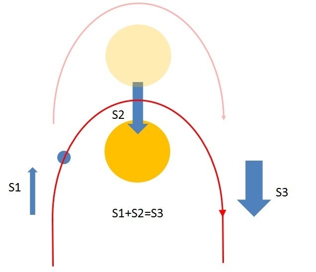 さらに「ベルトを掴んだ者が反対方向に動く」とエネルギーを増します。これが「スイングバイ」です。下図の通りS1のスピードだった選手は 走ってきたスピード(S1)+ 掴んで回した者の移動スピード(S2)=S3 にスピードアップして、反対方向に飛び出して行くことになります。