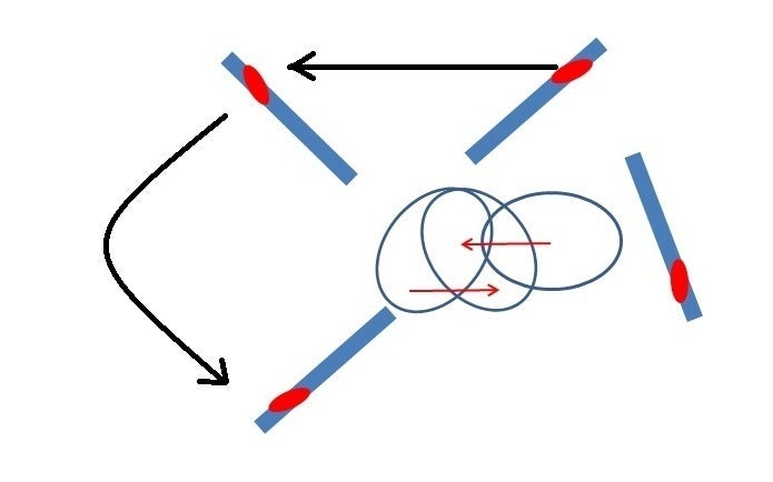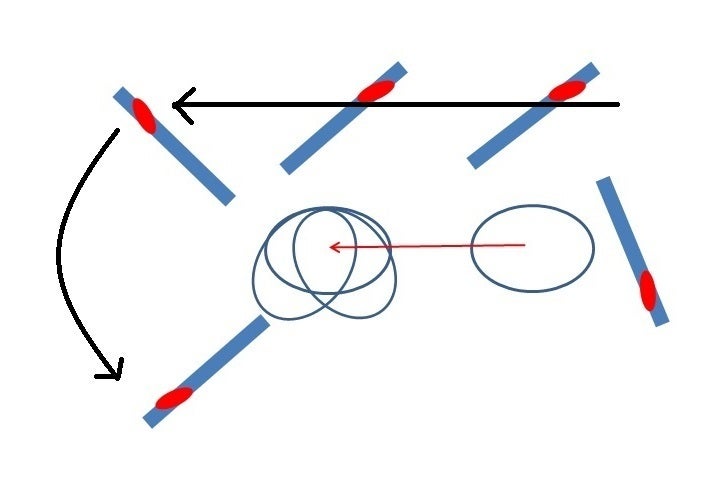 最も大事なことは「直線的にヘッドが移動する時間」があるか?ということ。直線(正確には線分)とは点と点を結んだ「最短距離」になります。「インサイドアウト」や「ボールの内側をたたく」そして「早く開くな」もこの直線運動のためのアドバイスフレーズです。円運動⇒円運動(開きっぱなし・外回り・ドアスイング)ではスイングバイは起こらないのです。