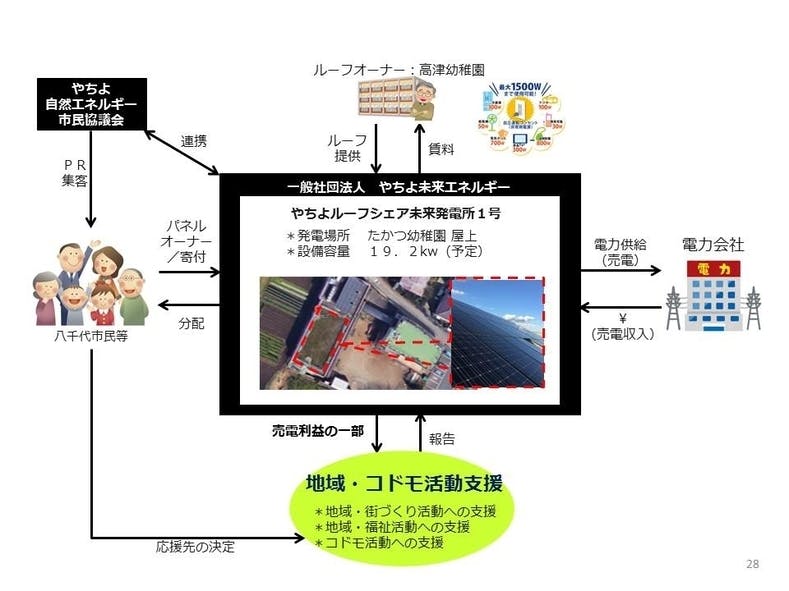 『やちよ未来市民発電所1号』は街の中で空いている空間である「屋根=ルーフ」をお借りして(シェアリングして)発電事業を行う「ルーフシェアリング発電所」として、自然環境に優しく、街の空きスペースを有効に活用して、自然エネルギーである太陽光を活用して八千代市内で自然エネルギー電力を生み出します。