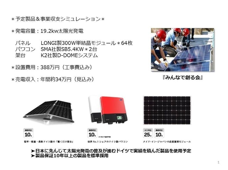 太陽光発電所建設費用(工事費込約388万円)の一部に充当します(予定)。不足分は擬似私募債、又は金融機関からの借り入れにて対応致します。