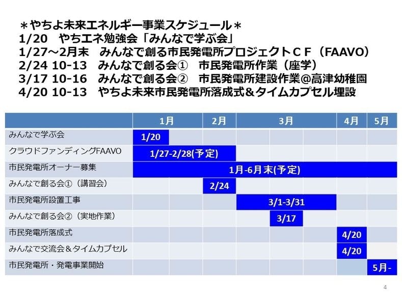 本クラウドファンディングプロジェクトを中心に資金調達を進めながら、以下事業スケジュールにて、DIOスキームを活用した「みんなで創る会」を開催し、「やちよ未来市民発電所1号」の建設、及び発電事業を進めて参ります。