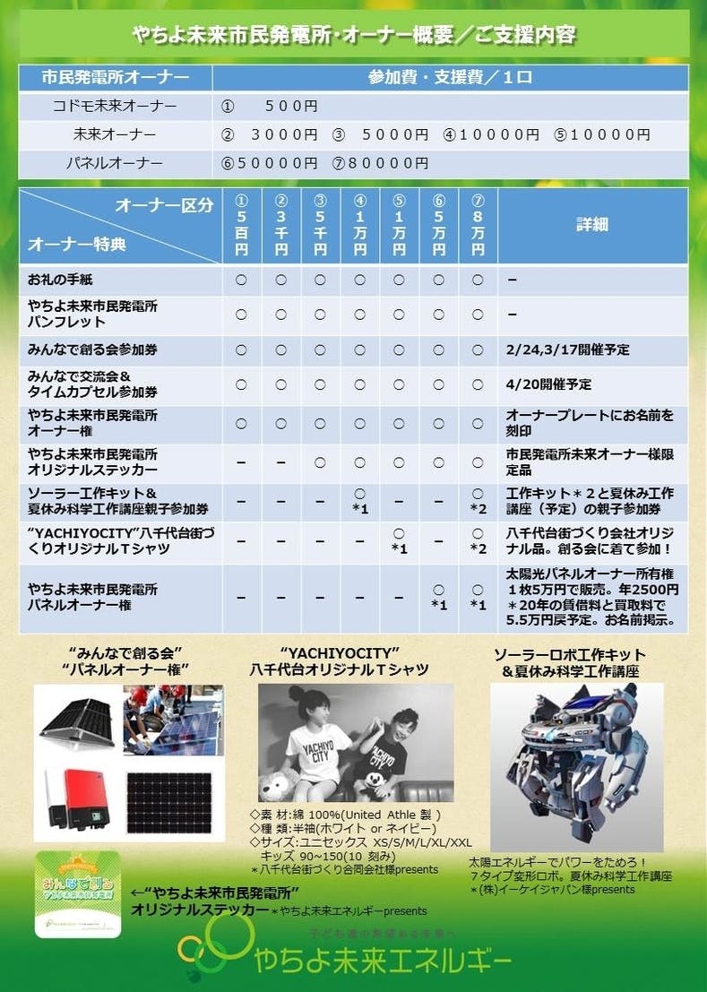 子ども1口500円~、ご家族で1口3000円~のご支援で市民発電所オーナーです