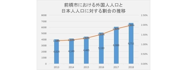 一方で他の都市と同じように少子高齢化が進んでおり、生産人口確保などを主な背景に外国人人口も年々増えています。群馬県全体で見ると、外国人人口比率は東京都や愛知県に次いで全国で3位、特に前橋においては若い留学生が多く、活気に満ち溢れています。