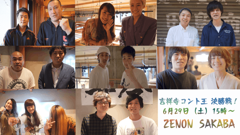 2019/06/24 23:54いよいよ今週末・29日に迫った吉祥寺コント王決勝! これまで3回に渡る予選を勝ち抜いた6組に加え、 これまでの総得点で上位だった敗者復活・2組を加えた 計8組のダイヤの原石を、決勝前に改めて紹介します!! ① 無知のち晴れ (左上・1回戦1位)榎並巧二(左)とシュガードラゴン(右)のコンビ。硬派な演技派。かのソクラテスを引用する知性が光る! (予選動画はこちらから!) https://youtu.be/GxpwqP_Xtsc ② こじらせハスキー(上段中央・1回戦2位) 橋爪ヨウコ(左)とドイツみちこ(右)の女性コンビ。それぞれピン芸人で活動後、2014年に正式にコンビ結成。スナックあるあるネタは吉祥寺にピッタリ!? ※ネタ動画は検索すると色々出てきます!(諸事情により公開NG) ③ ボクラしっく(右上・2回戦1位) たかおぽんと太田王子のコンビ。たかおぽんはかつて吉祥寺でバイトしていた。予選ではおっ〇ぶネタで会場を席巻!! https://youtu.be/1ZyPEGwFXYE④ ミスカンガルー (中段左・2回戦2位) がわちゃん(左)と平井貴之のコンビ。がわちゃんのキャラにハマる人続出!https://youtu.be/QQSgQEwkkCo ⑤ パンダパーク (中段真ん中・3回戦1位) はぶゆうた(左)とえんどうしょうたろうのコンビ。確かな演技力と予測不能の怒涛展開で、3回戦を一位通過! https://youtu.be/TFvUWOG60qY⑥ K (中段左・3回戦3位) 現役教師の大石(女性)と現役学生の藤田(男性)による異色コンビ!3回戦2位のコンビが決勝出場を辞退したことで繰り上げ当選!大石の妙な色気が勝利を呼び込む!? https://youtu.be/d86HYw6hZME⑦ 4VACANCES (下段左・敗者復活①(得点制))びゃい(中央)・みやざわ春紫苑(左)・お笑いテンプテーション(右)の長髪男子トリオ。吉祥寺コント王不動の司会者が奇跡の決勝進出!!(※忖度ではありません)https://youtu.be/ROgMezr-upU⑧ テンパランス (下段中央・敗者復活②(得点制)) 竹本たけぞー(左)とタテサカユウキ(右)のコンビ。上質のネタで予選でも高得点!見事、敗者復活!https://youtu.be/fpnLgbrORHo この8組が吉祥寺の初代コント王の座をかけて激突! 是非、29日の決勝を見に来てください! そして、当日会場にこられない人のため、吉テレでは29日の決勝直後に、全てのネタを公開!翌日のクラウファウンディング締め切り前に、8つのリターンを設置し、皆さんも吉テレコント王決定に参加できる仕組みを考えています! そして30日22時からは、ゼノンサカバより吉祥寺コント王決定報告の生中継!!詳細は次のレポートにて!! もっと見る