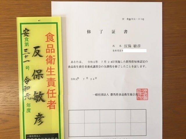 昨日、県内の某所で1日講習を受け、無事「食品衛生責任者」の認定を受けました。 講習は朝から夕方の4時まで、基本座学でした。 HACCP(ハサップ)制度の解説から始まり、衛生関係の諸法規、食中毒の知識など、結構広範囲にわたり講師の女性が延々と説明をしてくれ、途中に県警本部から暴力団対策についての話もありました。 参加者は、飲食店開業予定者や会社から言われとりあえず参加した様子の人、食品関係学科らしき女子高校など、年齢も多種多様な方々でした。 もらった認定証は黄色ベース・プラスチック製の少しチャッチイものですが、これからは名刺にも印字しようかと思います。 「食品衛生責任者」と!