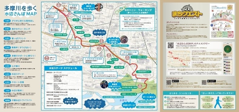 ・多摩川や多摩川の周辺の自然を体感していただくための試みをいくつも実施します。例えば、多摩川に注ぐ湧水の流れを追うお散歩マップを作成して自由に歩いてもらったり(今年はスマホアプリを活用したクイズラリーも実施!)、蓮池の蓮の葉をストロー代わりに使って飲み物を呑んだり、用水でざりがに釣りや笹船流しをしたりなど、市民が直接水や自然に触れ合える機会を多く作ります。また、ドローンを使った空撮、水辺のライトアップで当日新しい多摩川の見え方、景観資源としての価値を提案します。多摩川や水辺、自然の価値を改めて再認識してもらうことで、より府中市民が多摩川を身近に感じてもらえるようになることを期待して実施します。また、今年は飲食関係も充実♪♪楽しいイベントになること間違いなし!