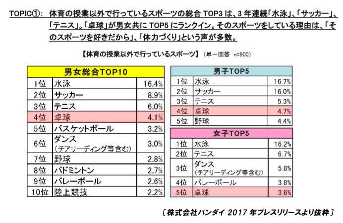 それをきっかけに、福原愛ちゃんや水谷選手のようになりたいと卓球に興味を持つ子供たちが急増したのです!あのオモチャで有名なバンダイさんが小中学生を対象にスポーツへの意識調査を毎年行っているのですが、2017年の意識調査では、体育の授業以外で行っているスポーツランキングで水泳やサッカー、テニスに次いで卓球は第4位!なんと暗いと言われていた卓球が4位ですよ!!革命が起きたと思いました(笑)