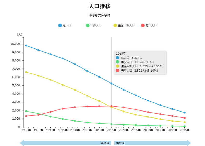 総務省の調査では今後も奥多摩の人口は減少すると予測されており、2045年には人口が2,000人を切ると予測されています。