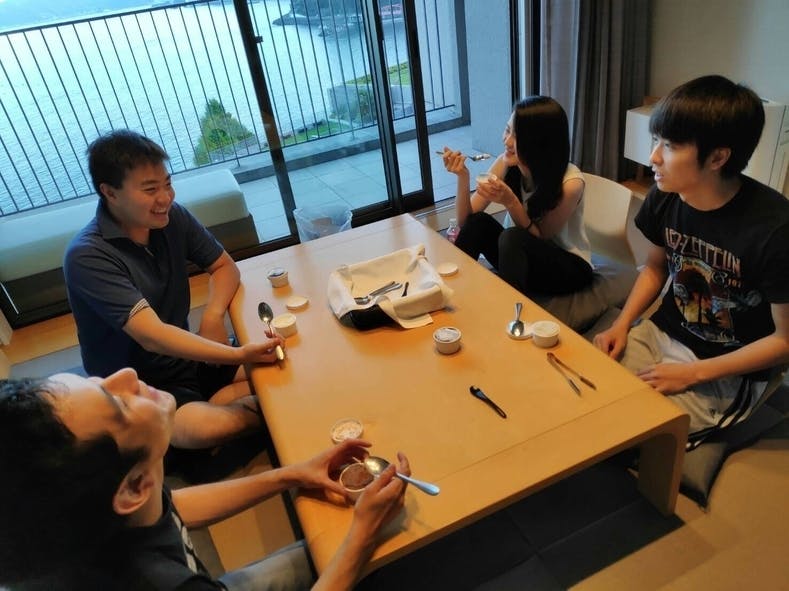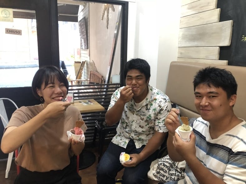 こども食堂当日に株式会社スポルアップ様から提供していただくジェラートの製造元のお店"Quattro Panchine"にアメフト部員4人で行ってきました。
