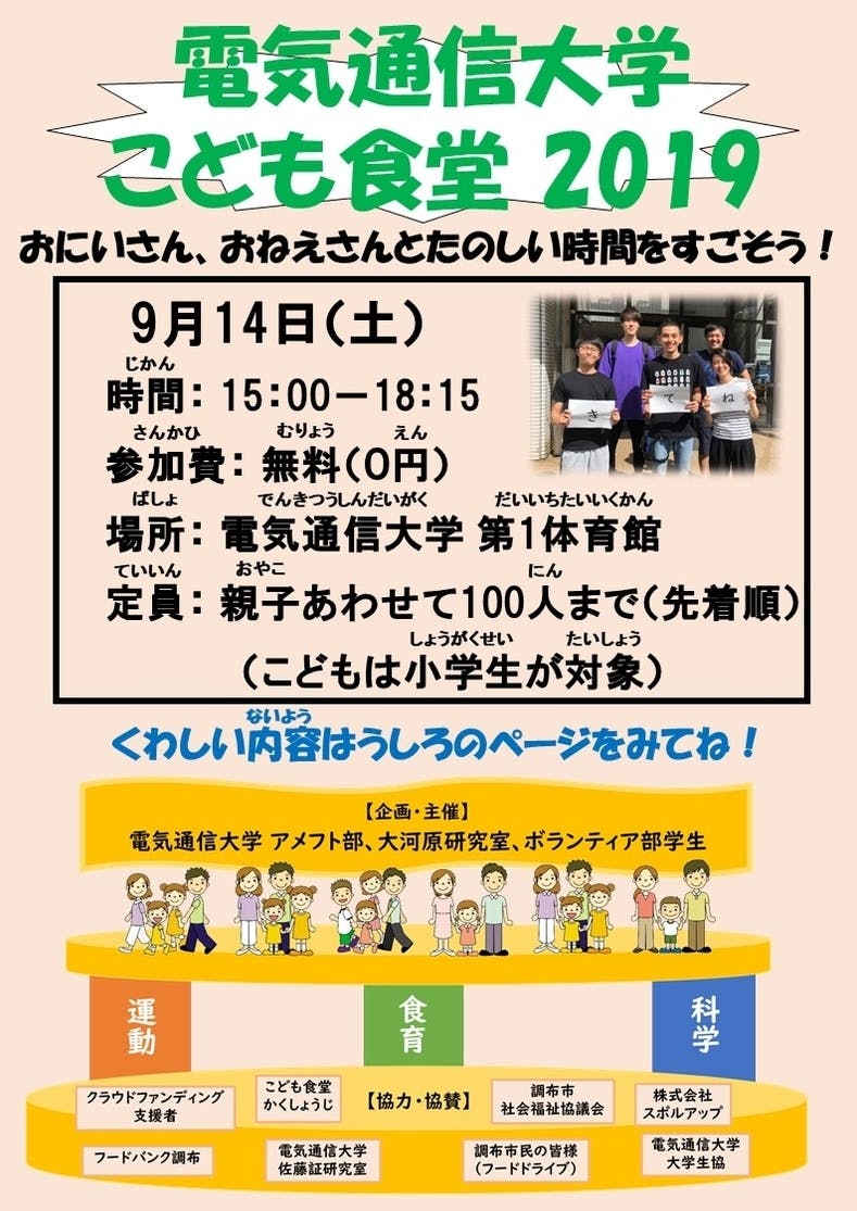 こんにちは! 大河原研究室の鈴木です。 昨日、皆様のご支援によって目標額を達成することが出来ました! ご支援いただきました皆様、ありがとうございました。 現在、このファンディングの目的である電通大こども食堂に多くのこどもたちからお申し込みをいただいており、キャンセル待ちが出ている状態です。 そこで、今後もファンディングを続けさせていただき、参加枠を拡大したいと考えております! 当日の準備も着々と進んでおり、より多くの皆さんに楽しんでいただけるようにこれからも頑張ります。 どうか、引き続きのご支援をよろしくお願い致します!