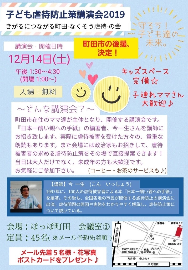 このイベントでは、『日本一醜い親への手紙 そんな親なら捨てちゃえば?』(dZERO刊)をCreate Media名義で編集したフリーライター・今一生さんが、子ども虐待に関する基礎知識や新しい防止策を解説する講演をします。 実際に、親に虐待されても必死で生きてきた成人となった子ども達たちがオリジナルの「親への手紙」を朗読し、虐待される痛みを市民と分かち合います。 そして会場には市議会議員をお招きして、虐待被害者が望む子ども虐待防止策を提案し、議会にはかるよう、その場で検討していただきます。 もちろん、参加した全員がその場で市議会議員の皆様に、虐待防止策を提案できます。 終了後には任意参加のお茶会もあり、虐待被害者どうしが気持ちを分かち合い、次の活動へつなげていきます。 こんなイベント、他では絶対にありえません。 それが「子ども虐待防止策 講演会 2019」なのです。