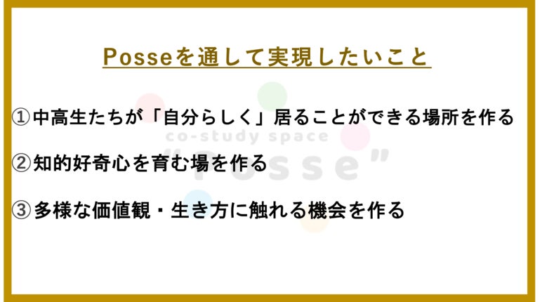 Posseは中高生のサードプレイスとして、子どもや生徒としての役割から一旦離れ、自分自身と向き合いながら心地よく過ごせる場を提供していきます。