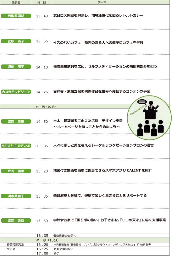 ・告知拡散:プレゼンターのビジネスプランを多くの方に知って頂く機会を提供